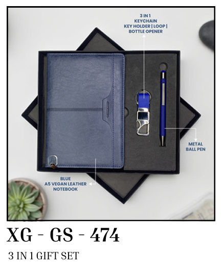 Package Content : 3 in 1 gift set blue a5 vegan leather notebook & 3 in 1 keychain keyholder loop bottle opener & metal ball pen