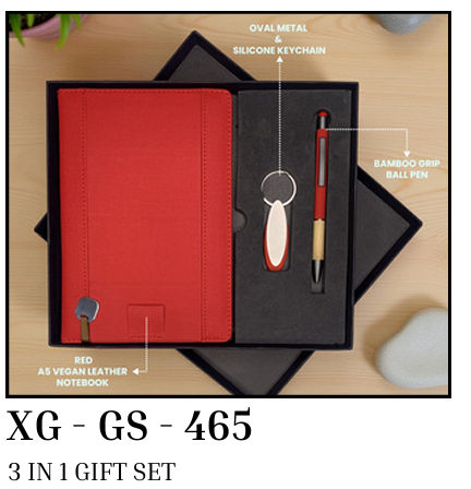 3 in 1 gift set red a5 vegan leather notebook & oval metal & silicone keychain