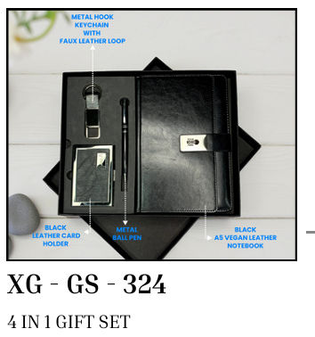 Package Content : 4 in 1 gift set black leather card holder & metal hook keychain with faux leather loop & metal ballpen & black a5 vegan leather notebook