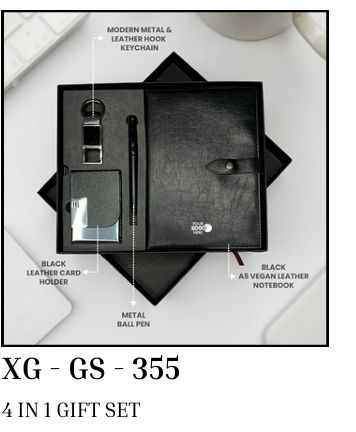 Package Content : 4 in 1 gift set black leather card holder, modern metal & leather hook keychain, metal ball pen & black a5 vegan leather notebook