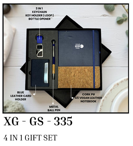 Package Content : 4 in 1 gift set blue leather card holder 3 in 1 keychain key holder loop bottle opener & metal ball pen and cork pu a5 vegan leather notebook