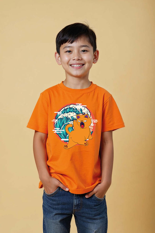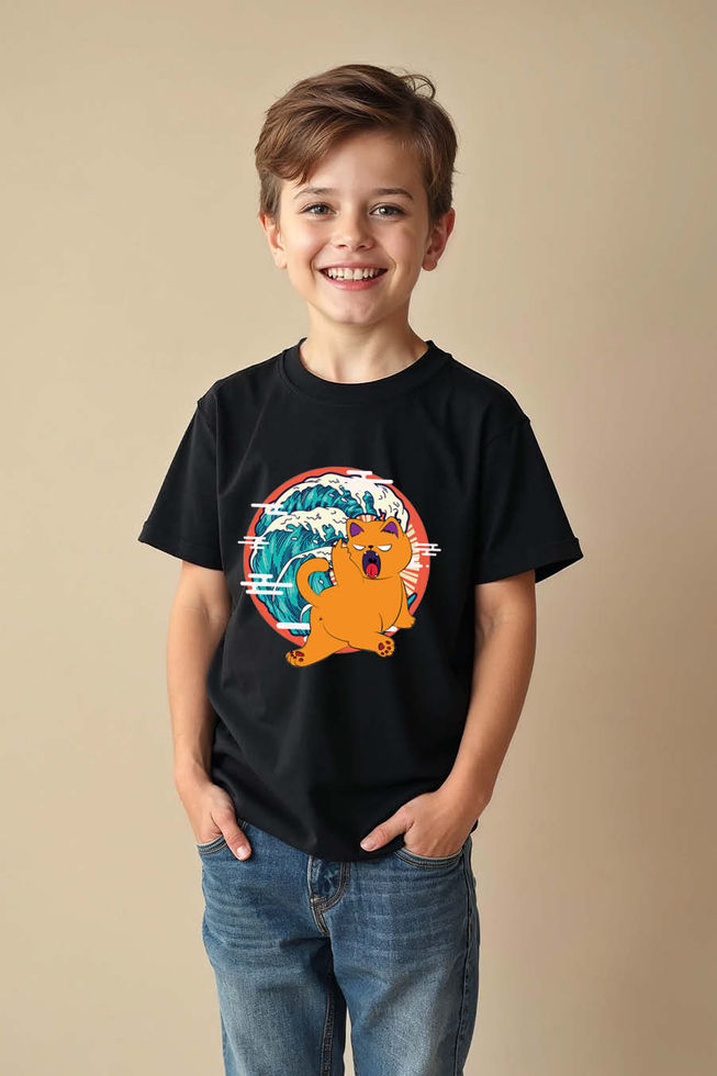 Angry Cat Printed T-Shirt for Kids – Funny Cartoon Cat with Ocean Wave Graphic