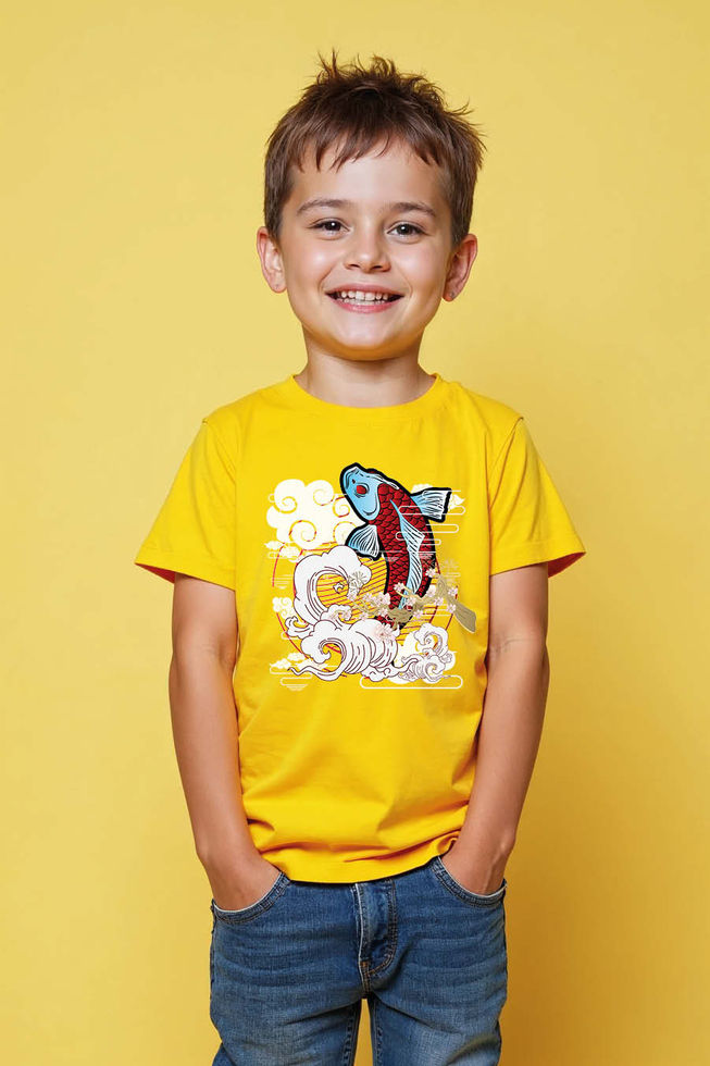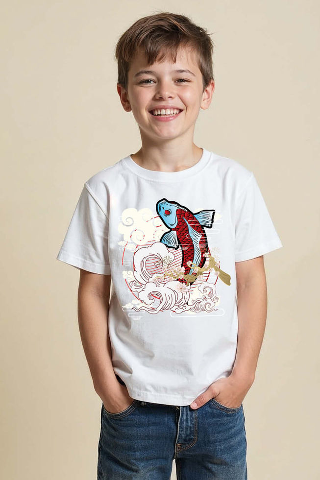 Blue Koi Cloud Wave Colorful Unisex Kids Graphic Tee – Cartoon Print Design