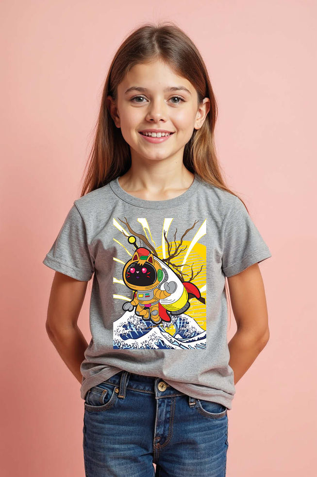 Cat Rocket Surfer Trendy Stylish Kids Graphic T-Shirt – Artwork Print Design