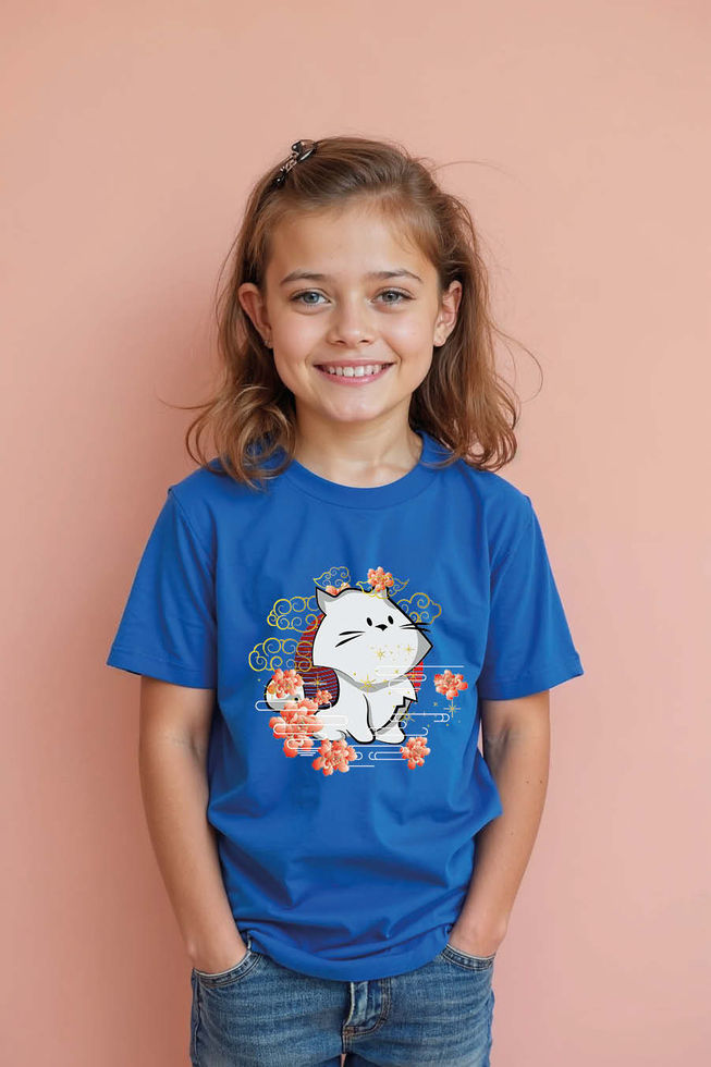 Chibi White Cat Red Sun Sakura Modern Trendy Printed Tee for Kids – Quote Print