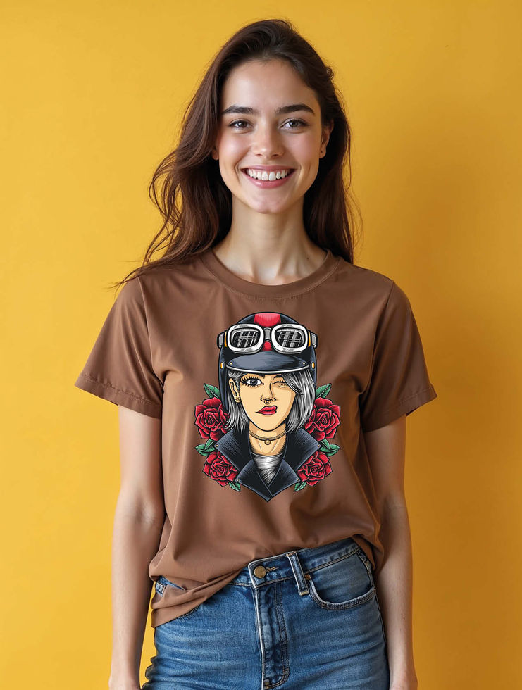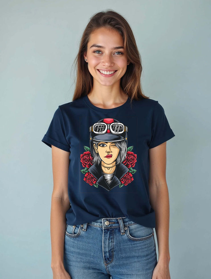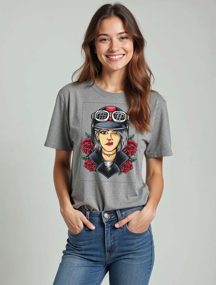 Cool Biker Girl with Roses Cool Women’s Streetwear T-Shirt – Shop Now