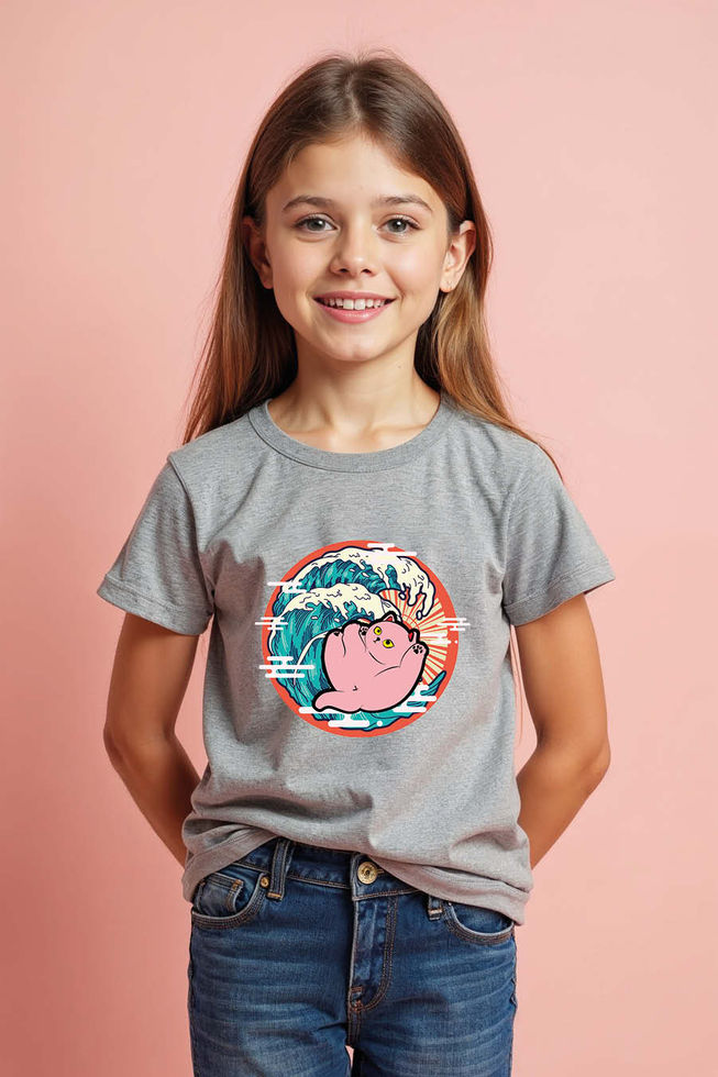 Cute Cat Printed T-Shirt for Kids – Funny Wave Art Cartoon Graphic Tee