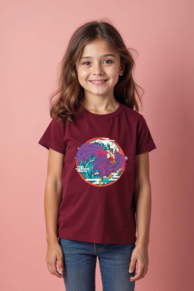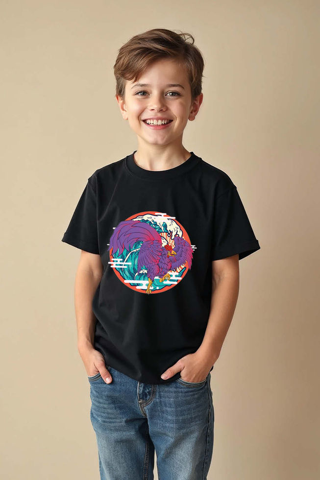 Fierce Phoenix Printed T-Shirt for Kids – Vibrant Purple Bird with Ocean Wave