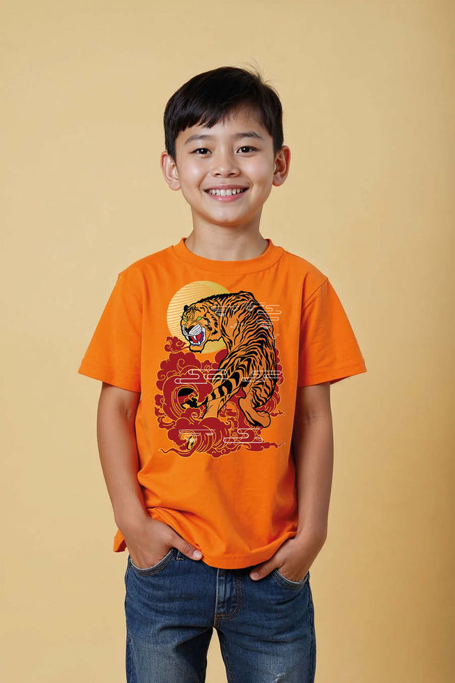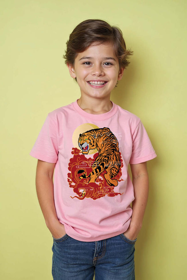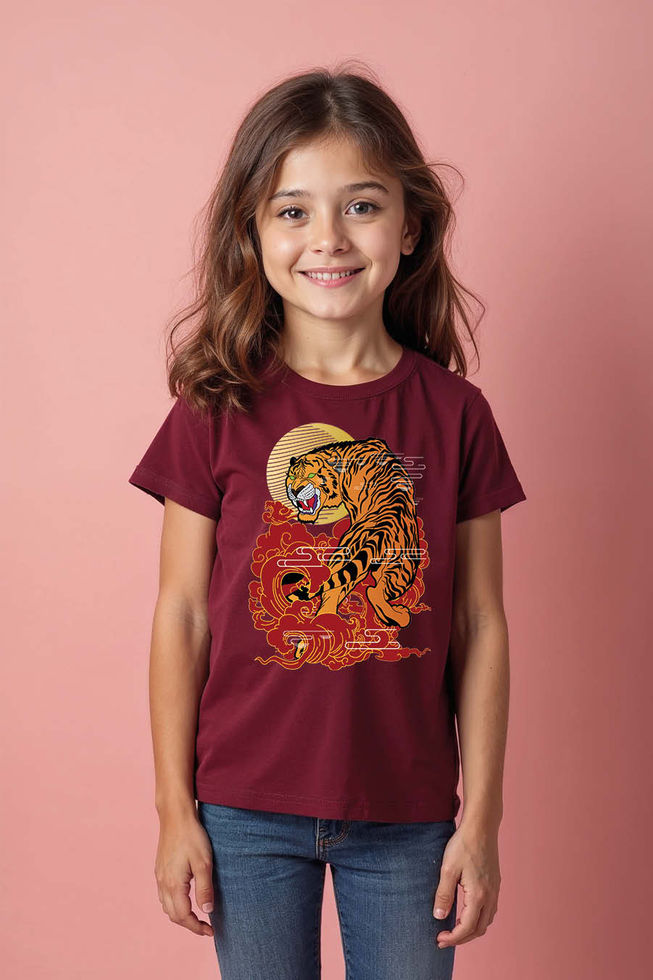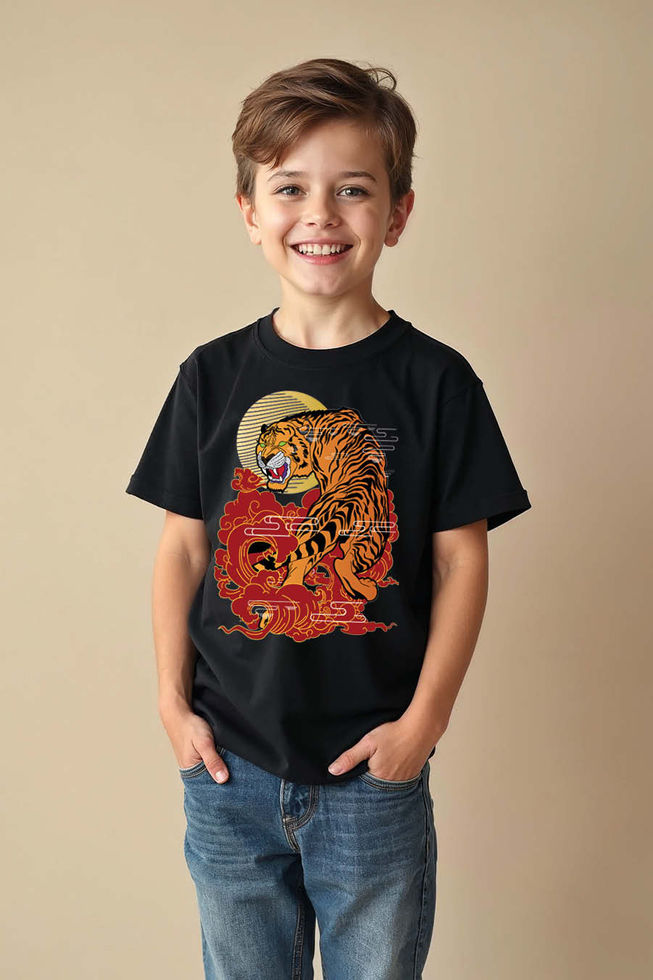 Fierce Tiger and Moon Printed T-Shirt for Kids – Powerful Japanese Art Graphic