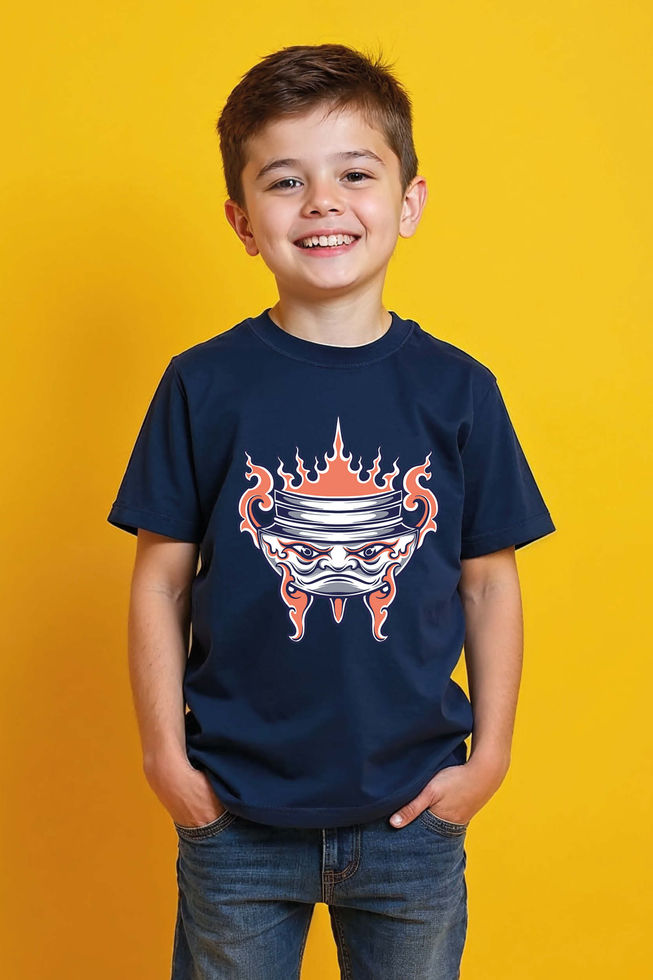 Flames and Warrior Helmet Kids T-Shirt Cotton Typography Print T-Shirt for Kids