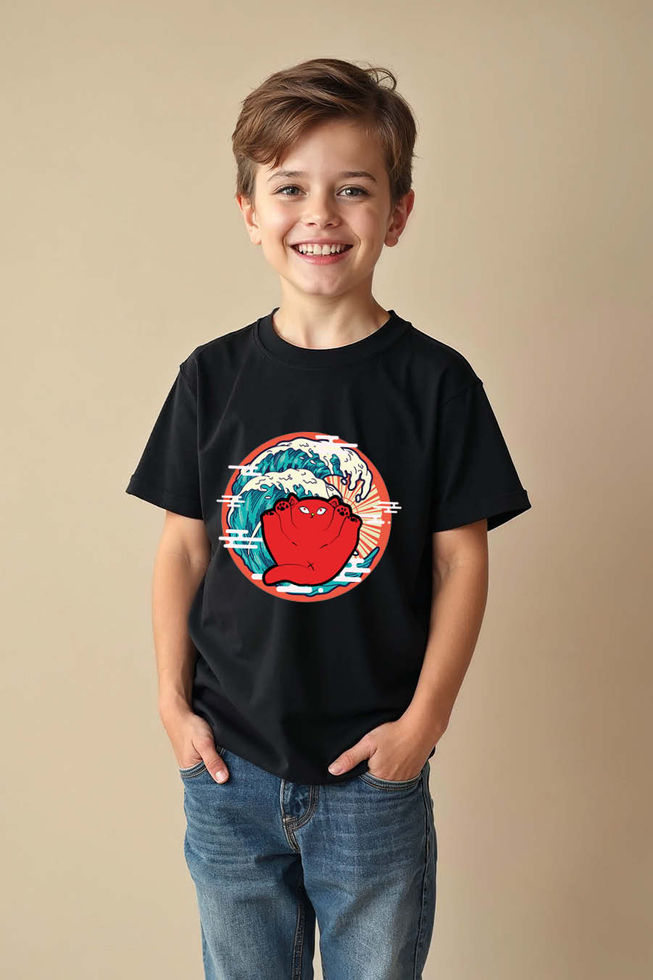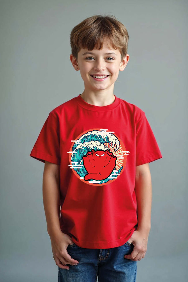 Funny Red Cat Printed T-Shirt for Kids – Wave Art Cartoon Graphic Tee