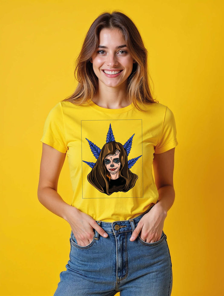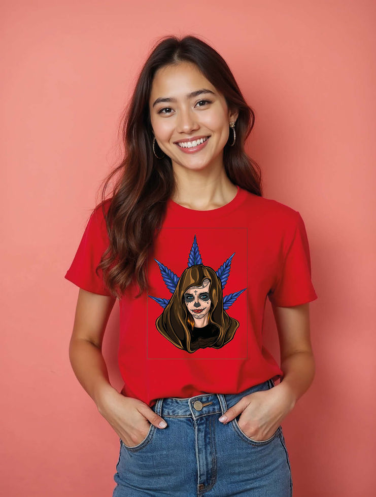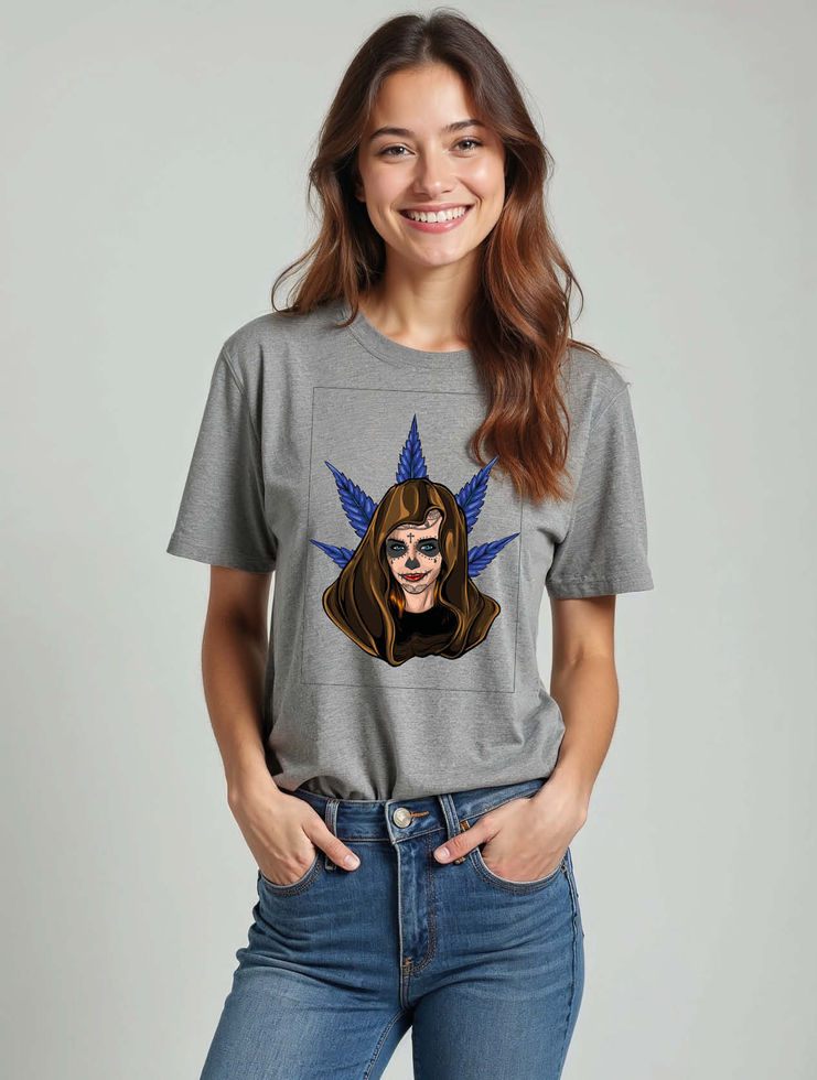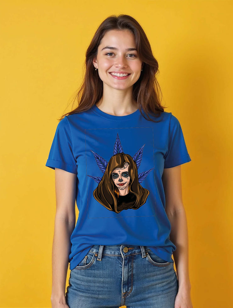 Gothic Woman and Blue Cannabis Leaf Stylish Women’s Printed Graphic T-Shirt