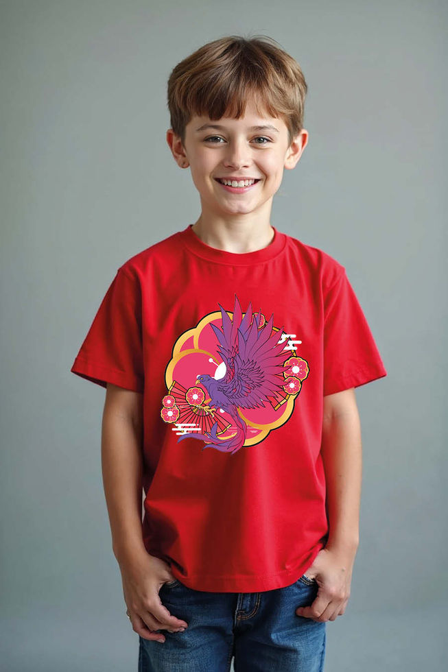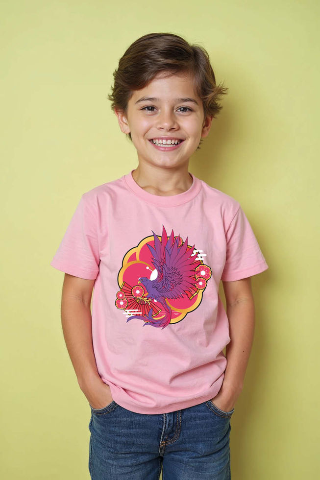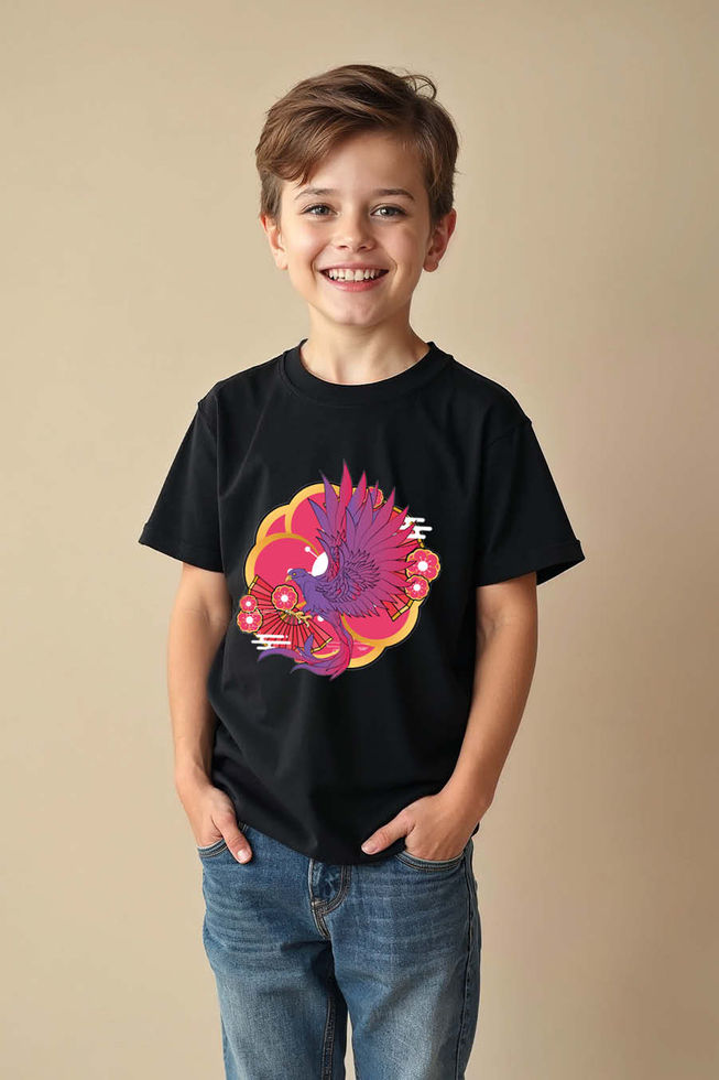 Grey Elegant Phoenix Printed T-Shirt for Kids – Majestic Purple Bird