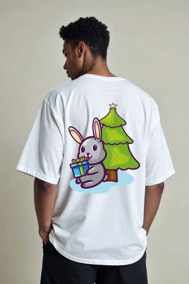 Holiday Bunny with Gift and Christmas Tree Unisex Drop Shoulder Oversized Tees