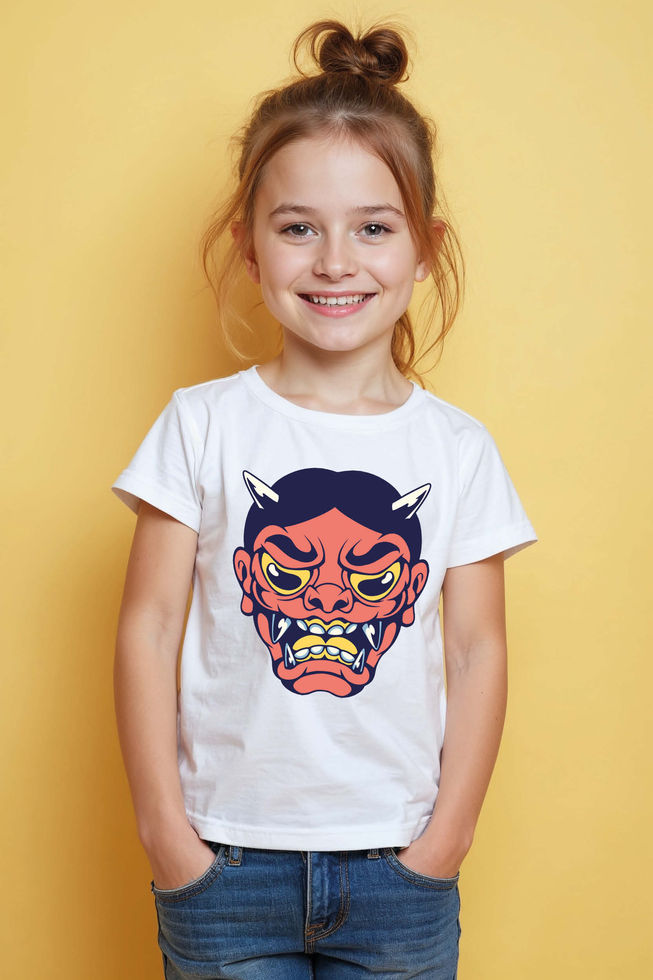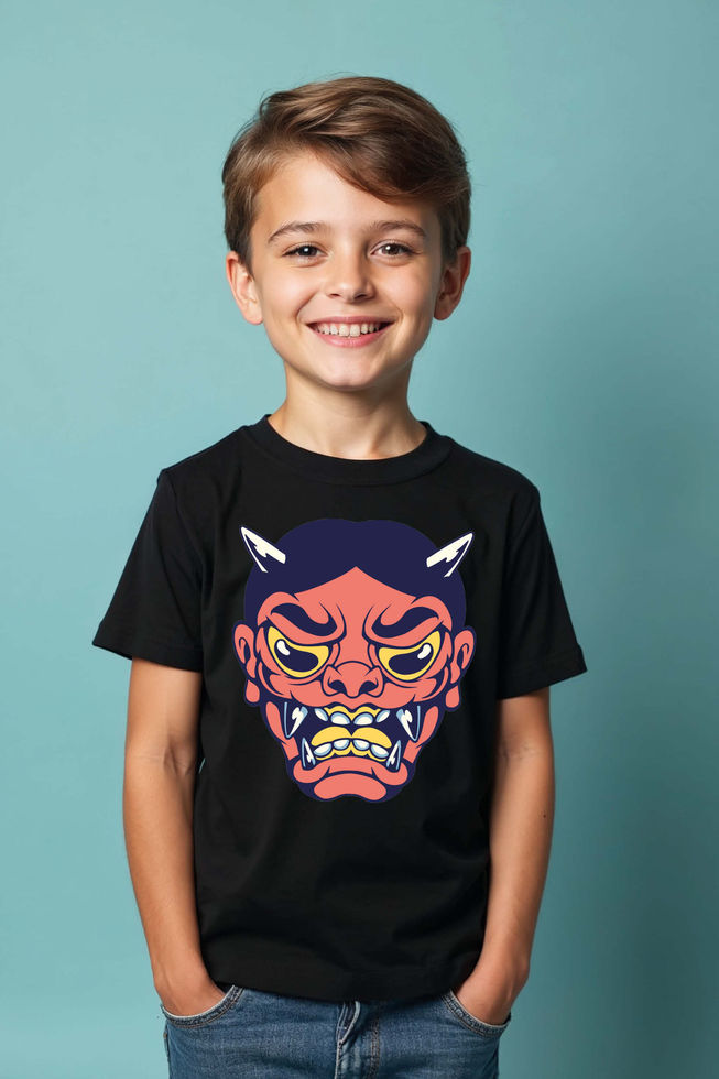 Kids' Red Oni Demon Mask Graphic T-Shirt Playful Kids Printed T-Shirt – Typograp