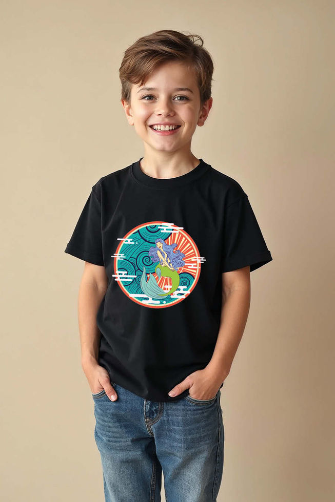 Mermaid Rising Sun Printed T-Shirt for Kids – Vibrant Ocean Fantasy Art