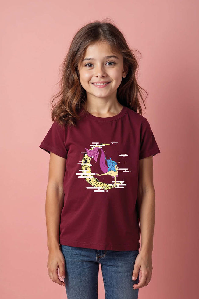 Mermaid Sitting on Moon Printed T-Shirt for Girls – Magical Fantasy Graphic Tee