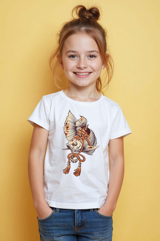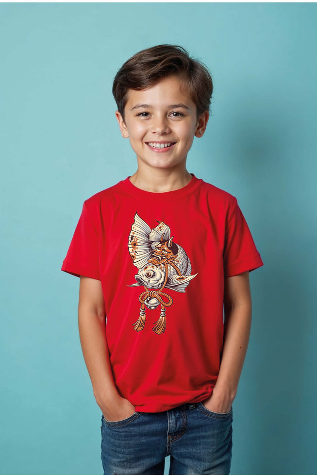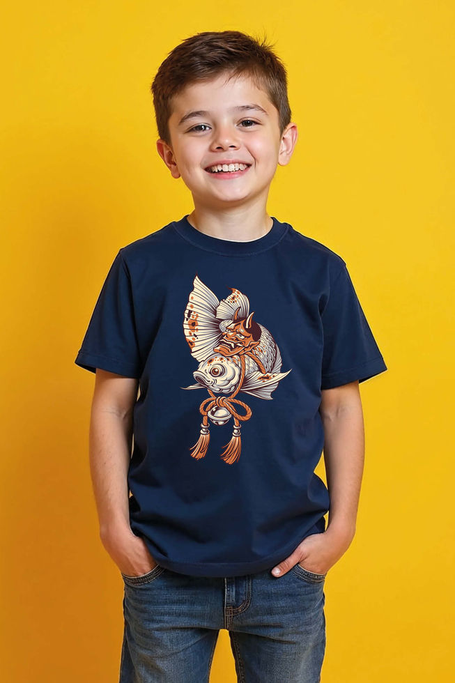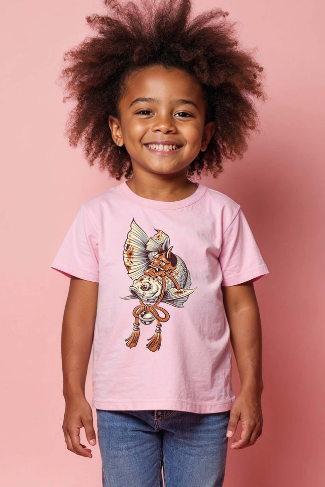Oni Mask Riding Goldfish Kids T-Shirt Vibrant Typography Print T-Shirt for Kids