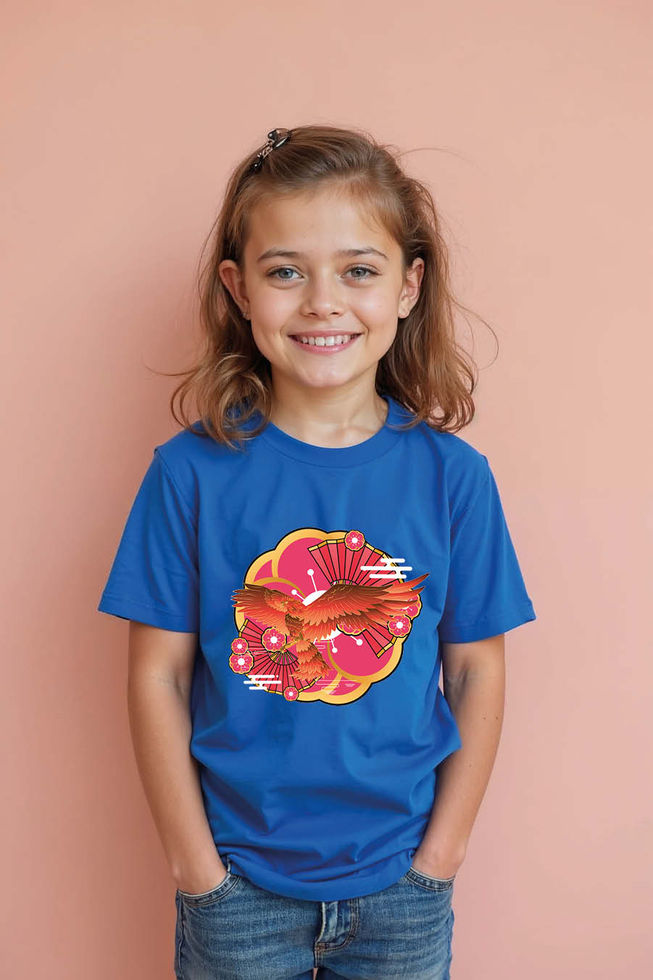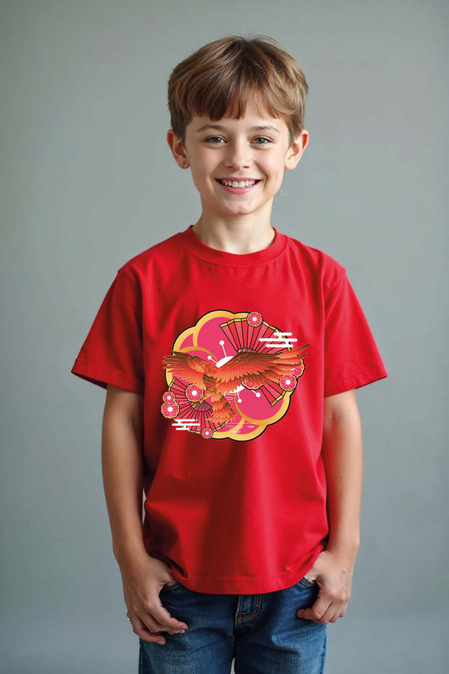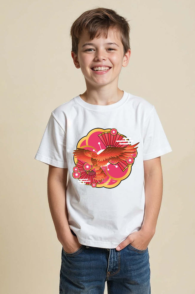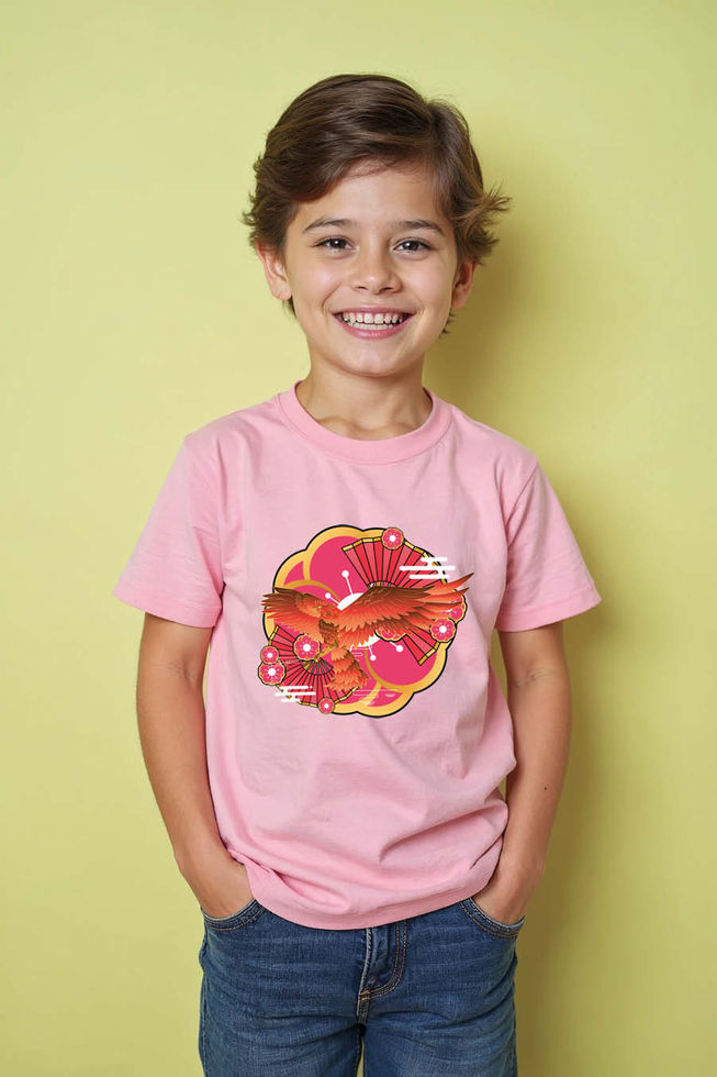 Phoenix Blossom Kids T-Shirt – Fiery Bird with Floral Sunburst Graphic