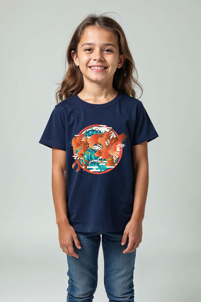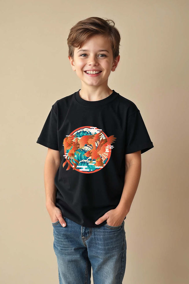 Phoenix Wave Kids T-Shirt – Artistic Flying Bird and Ocean Graphic Tee