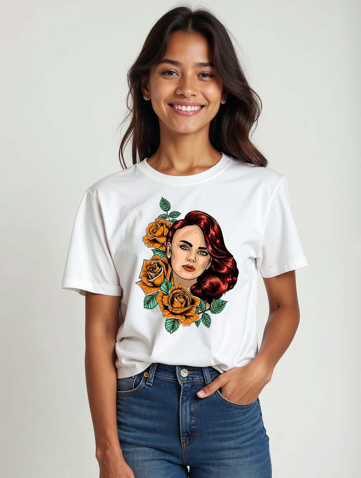 Red-Haired Woman and Orange Roses Trendy Women’s Printed Graphic Streetwear Tees