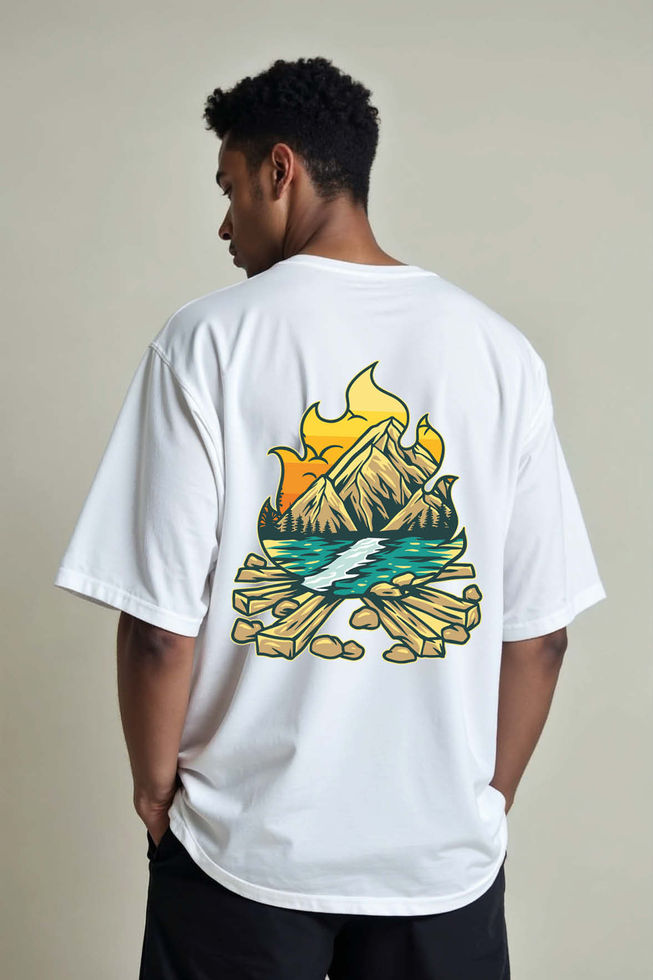 Scenic Campfire Mountain Urban Anime Unisex Oversized Drop Shoulder T-Shirt