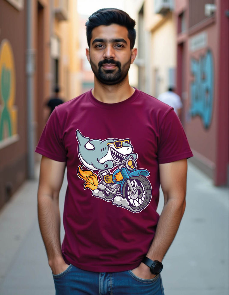 shark riding motorcycle hand drawn mens printed graphic t shirt