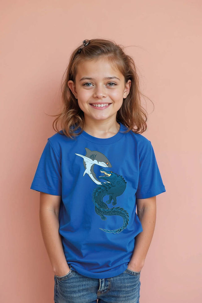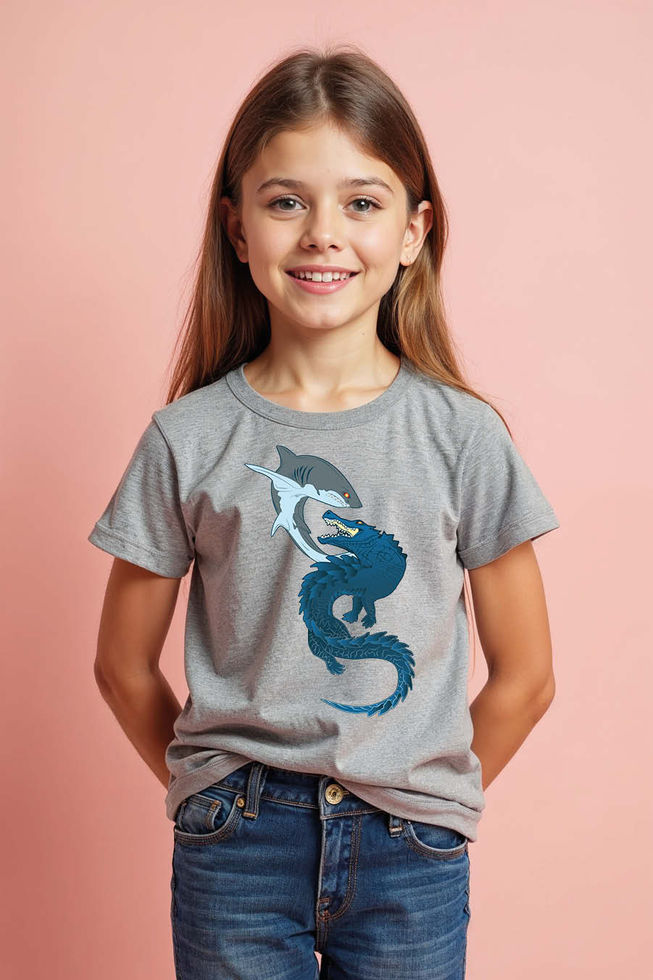 Shark vs Dragon Battle Printed T-Shirt for Kids – Epic Fantasy Graphic Tee