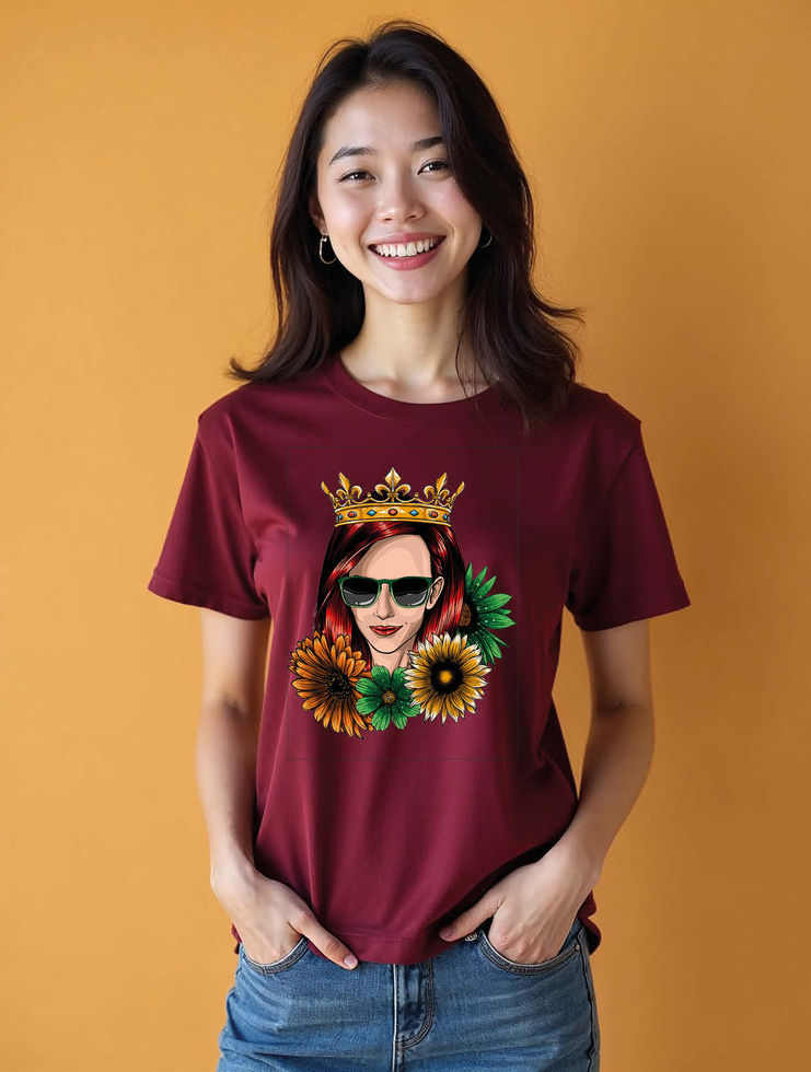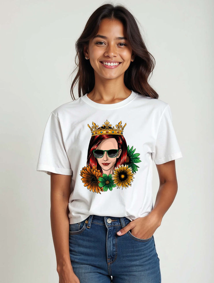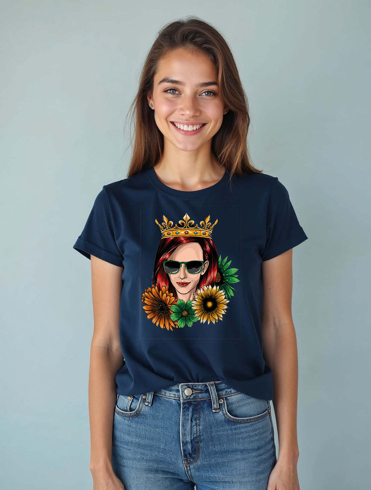 Stylish Queen in Sunglasses and Crown with Sunflowers tees for womens