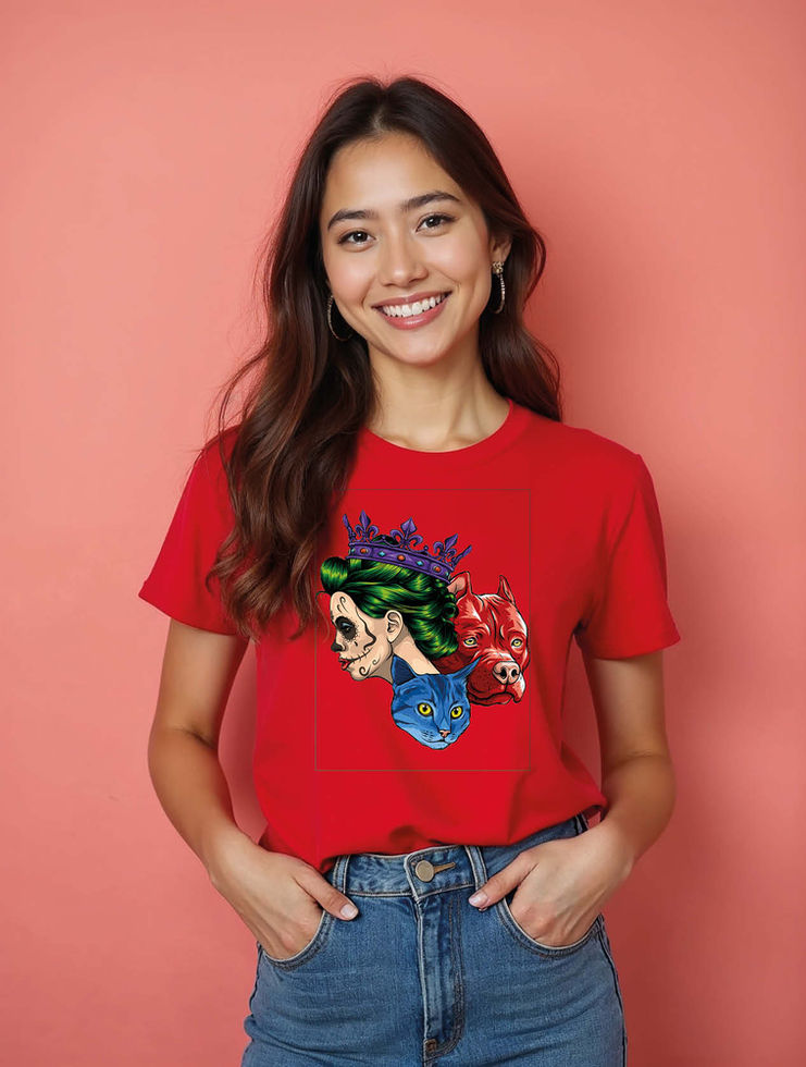 Sugar Skull Queen, Cat, and Pitbull Trendy Women’s Printed Graphic T-Shirt