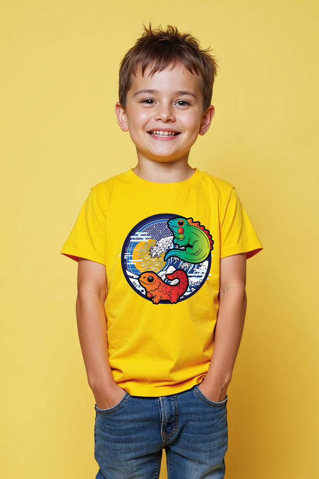 Twin Chameleons Printed T-Shirt for Kids – Cute Colorful Lizard Duo with Wave