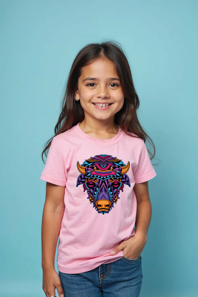 Vibrant Abstract Geometric Bison Head T-Shirt for Kids | Intricate Tribal Mosaic