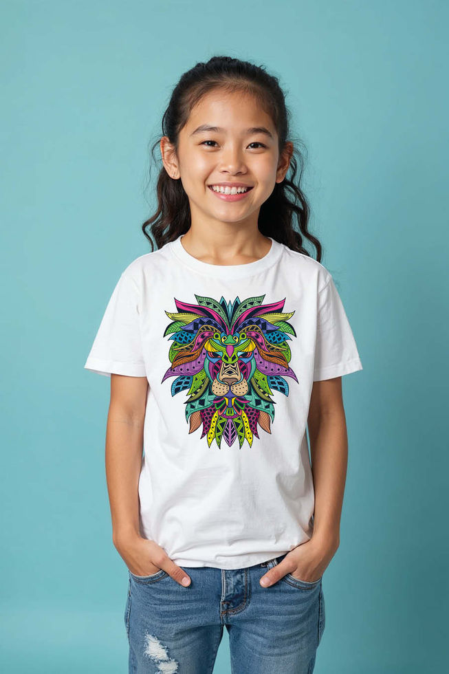 Vibrant Abstract Geometric Lion Head T-Shirt for Kids | Detailed Neon Tribal Mos