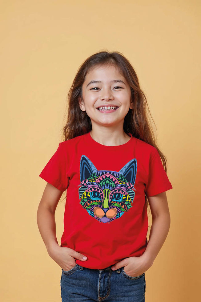 Vibrant Geometric Cat Face T-Shirt for Kids | Intricate Neon Tribal Mosaic
