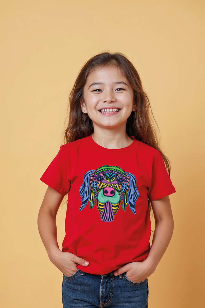 Vibrant Geometric Dog Face T-Shirt for Kids | Intricate Neon Tribal Mosaic Puppy
