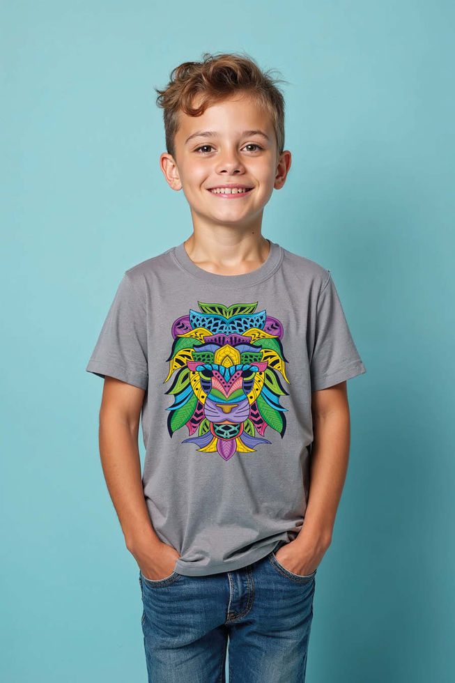 Vibrant Geometric Lion Head T-Shirt for Kids | Intricate Neon Tribal Mosaic King