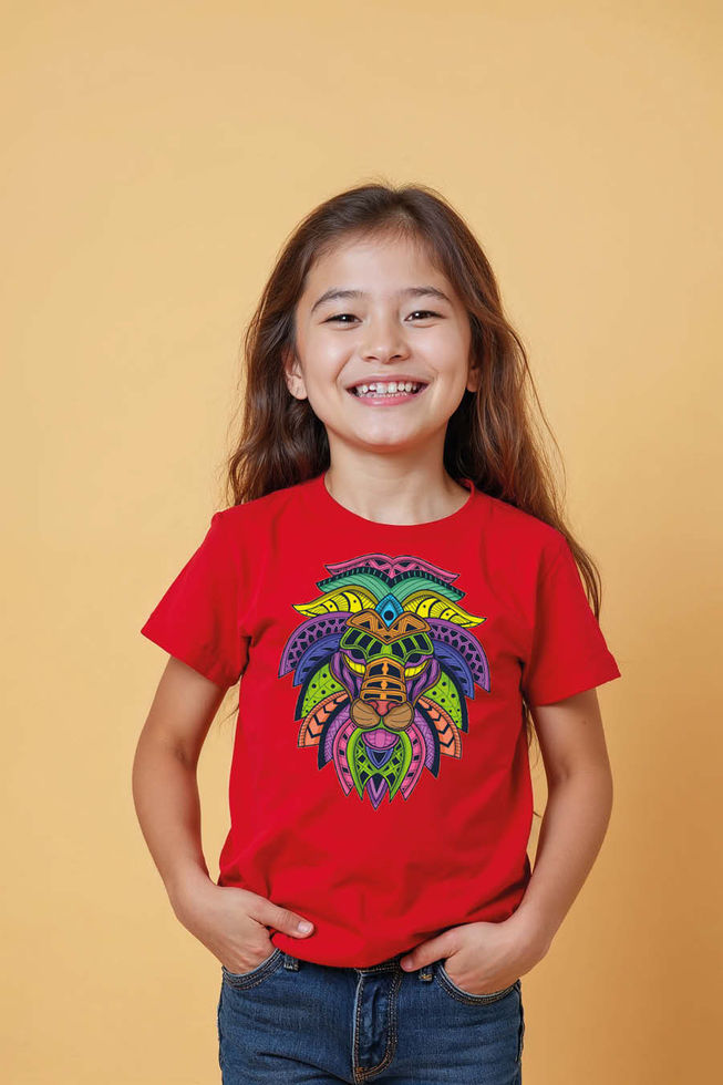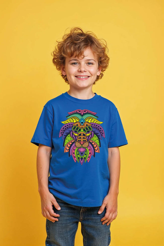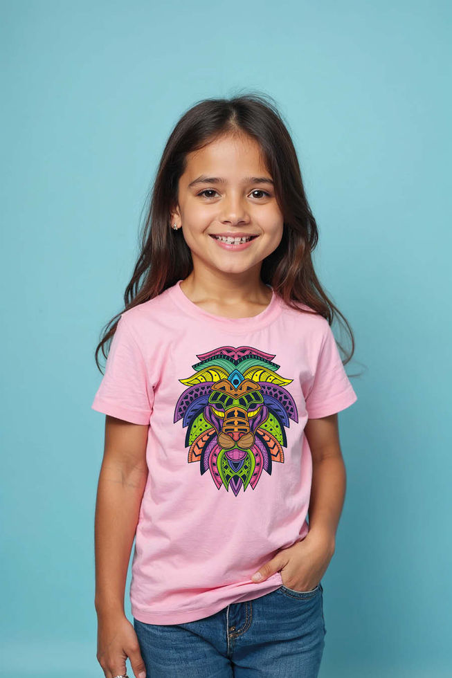 Vibrant Geometric Lion Head T-Shirt for Kids | Intricate Neon Tribal Mosaic Lion