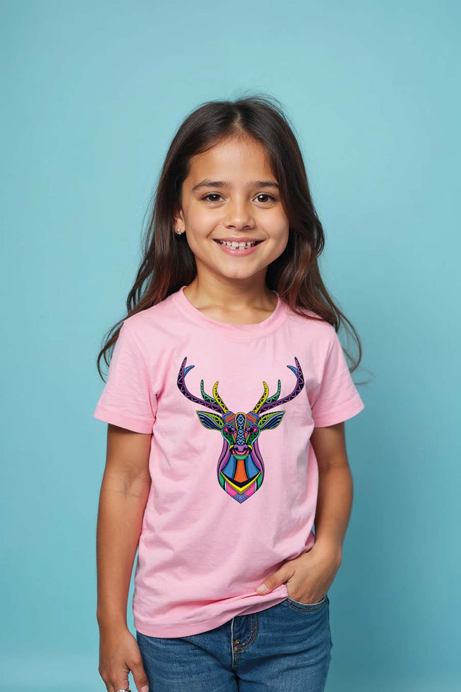 Vibrant Geometric Stag Head T-Shirt for Kids | Intricate Neon Tribal Deer